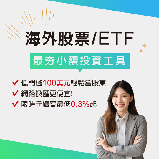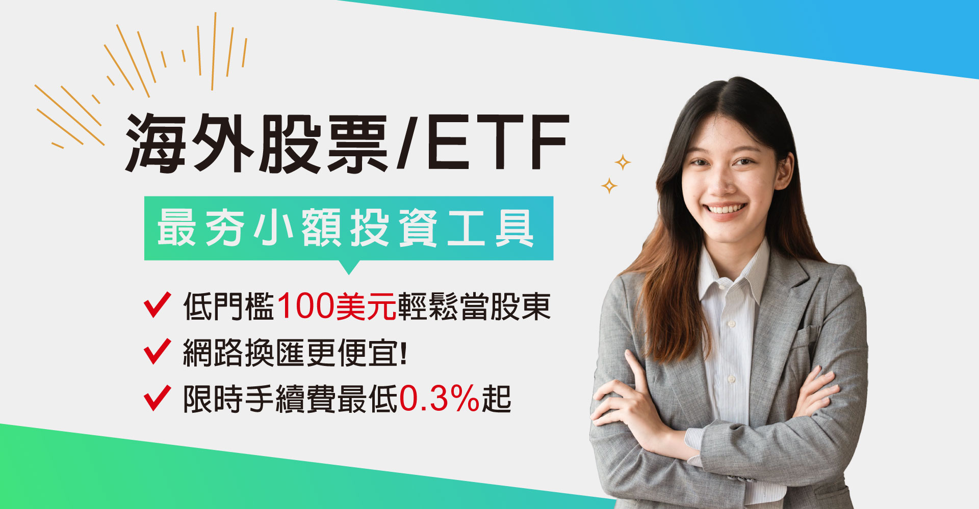 海外股票/ETF最低申購金額依各商品幣別分為美元100元、港幣100元、人民幣100元。